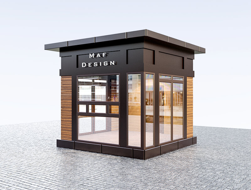 В первом варианте модель выполнена в размере 3000х2000. Киоски с большими открытыми окнами на боковых фасадах вызывают доверие у клиентов, так как покупатели могут наблюдать за приготовлением кофе или хот-догов. Вдоль окон сделана столешница, чтобы клиент мог спокойно перекусить и поставить чашечку кофе. Маркизы над окнами придают киоску стильный вид и укрывают клиентов от палящего солнца или осадков. Чем больше киоск, тем больше у вас возможностей для торговли. Киоск 4000х3000 позволяет организовать в помещение небольшую кухню, чтобы готовить пиццу, салаты или бургеры. В таком киоске можно установить холодильники для хранения напитков и продуктовых запасов.